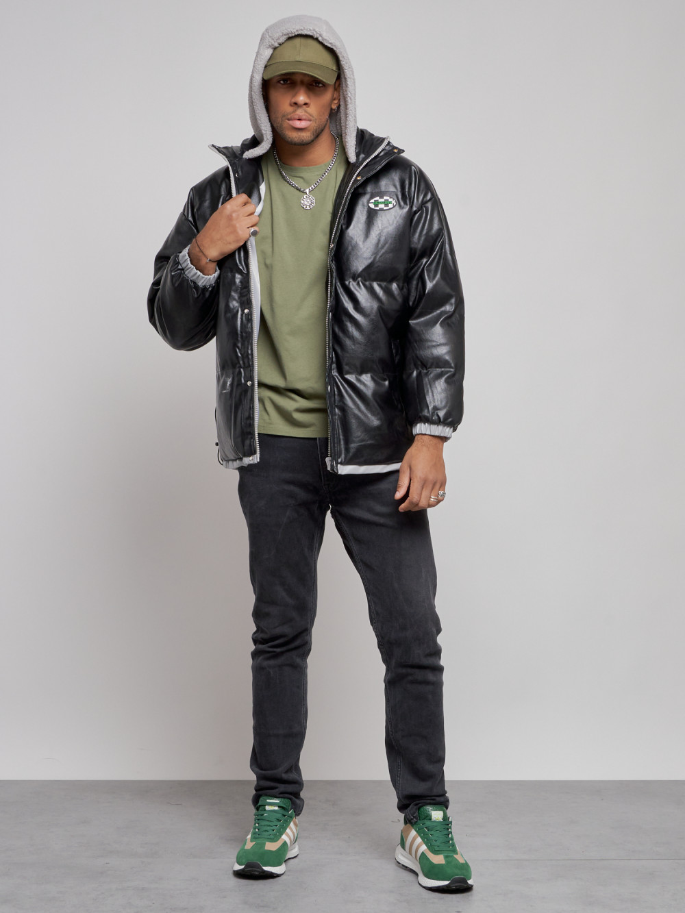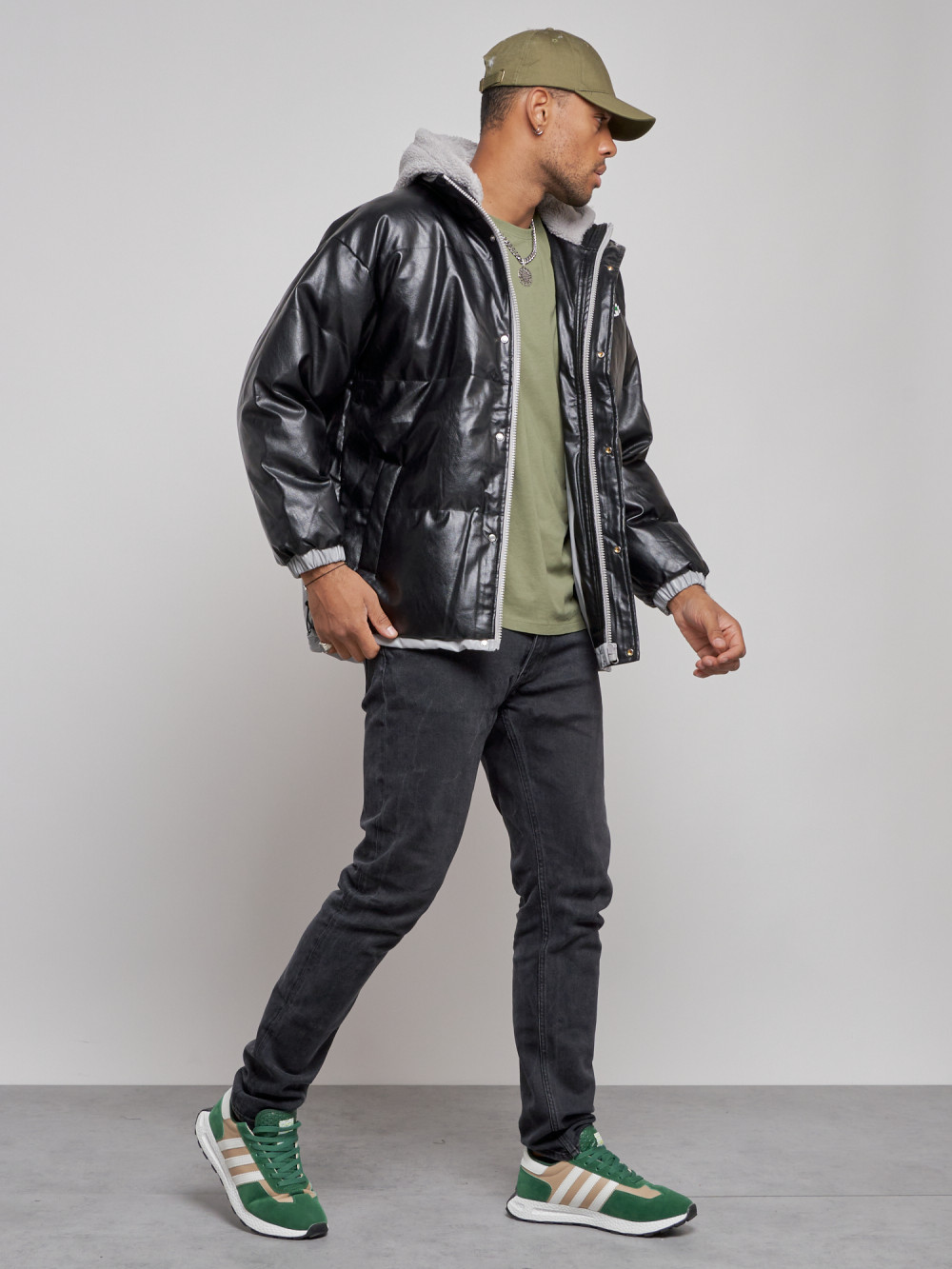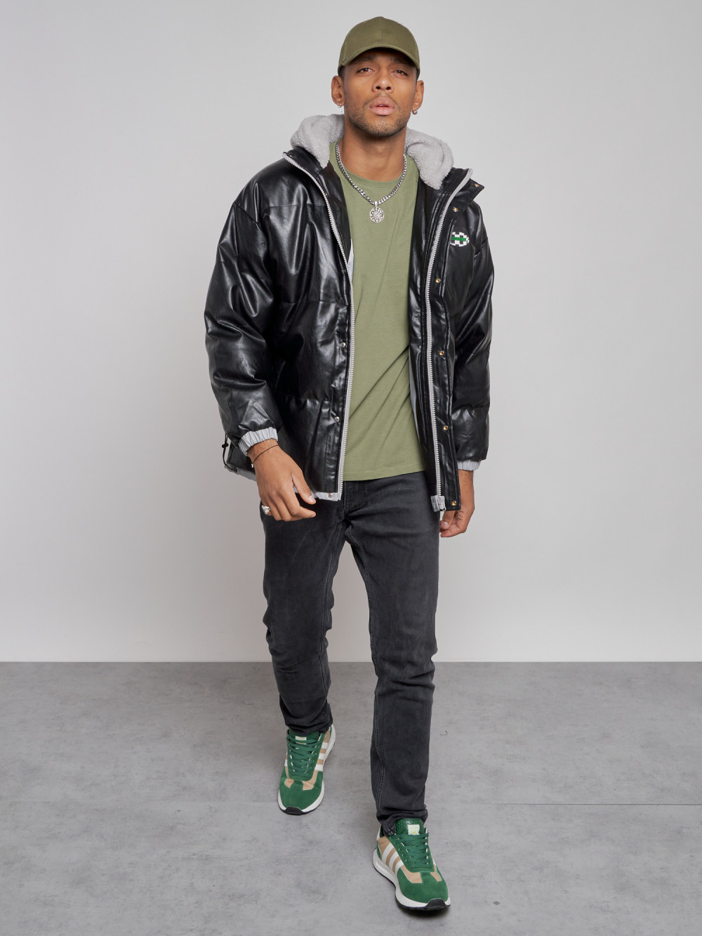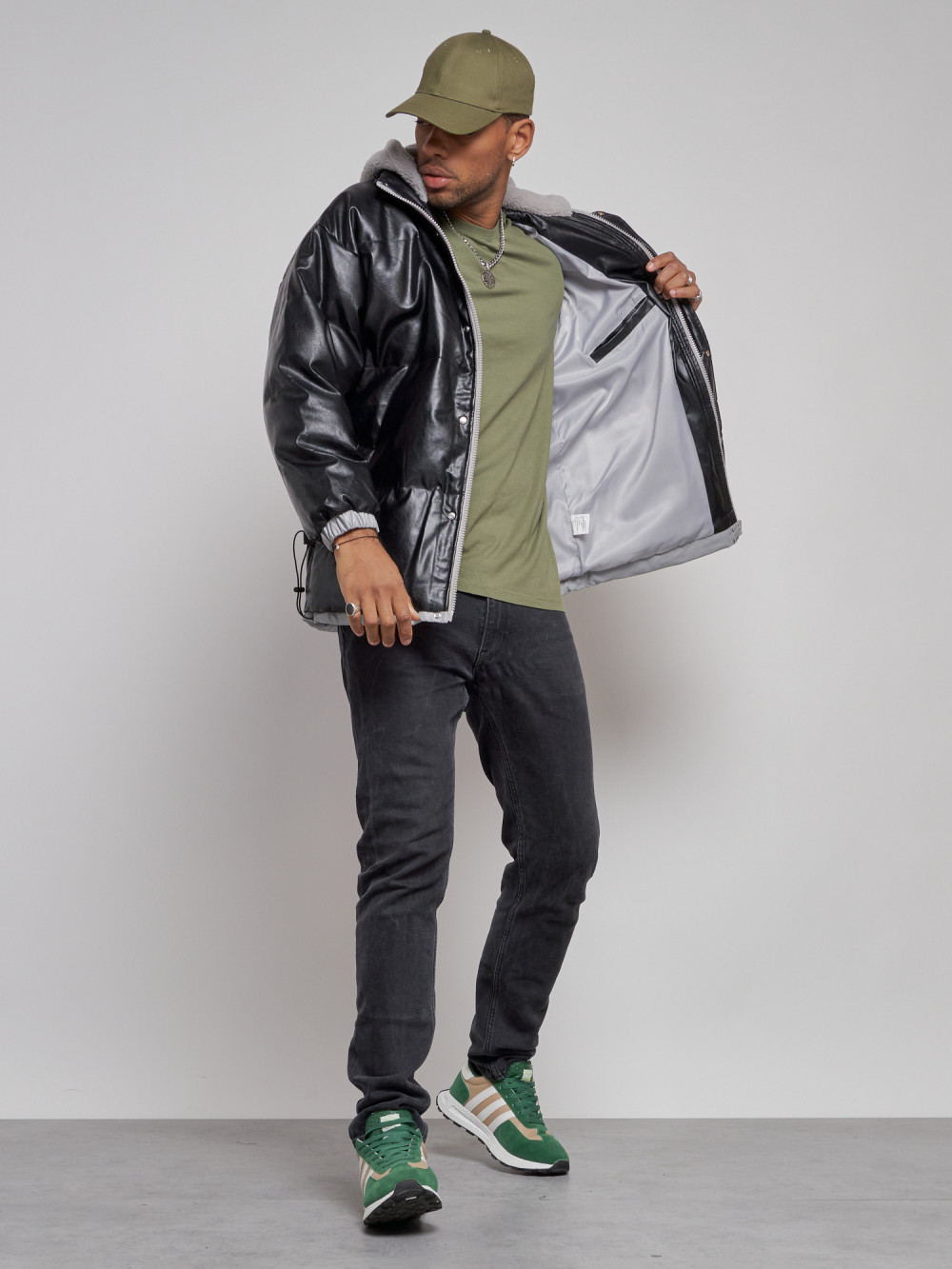 Куртка из экокожи мужская с плюшевым капюшон черного цвета 28132Ch