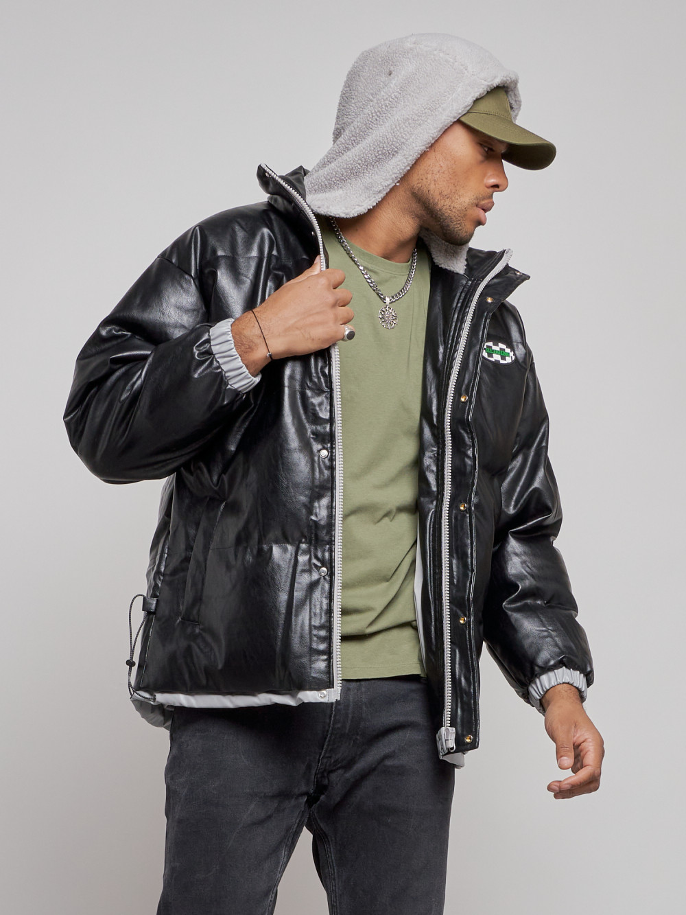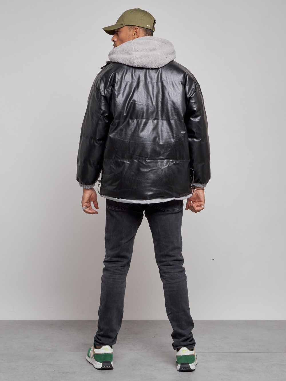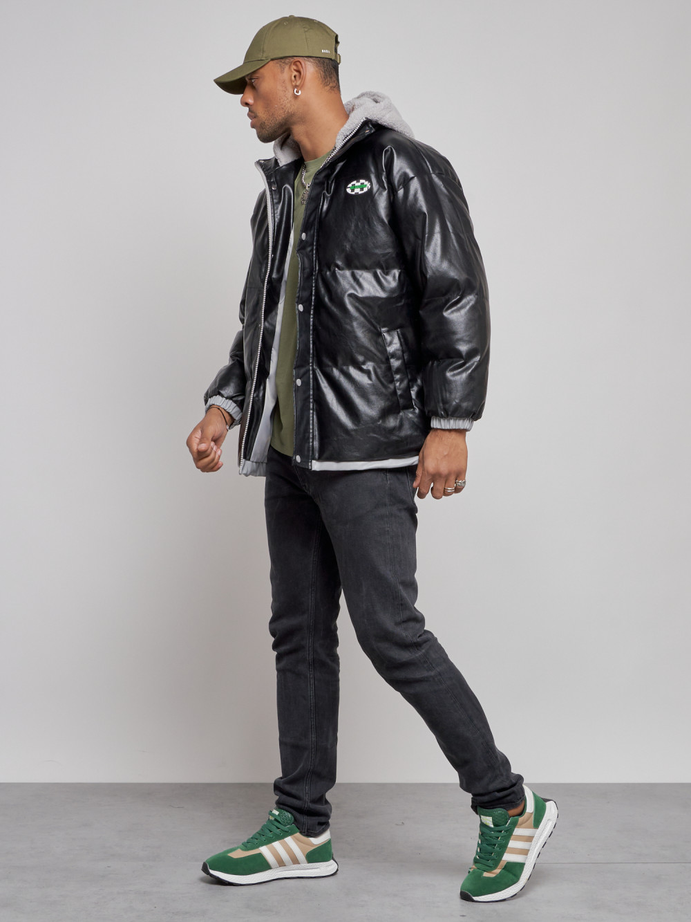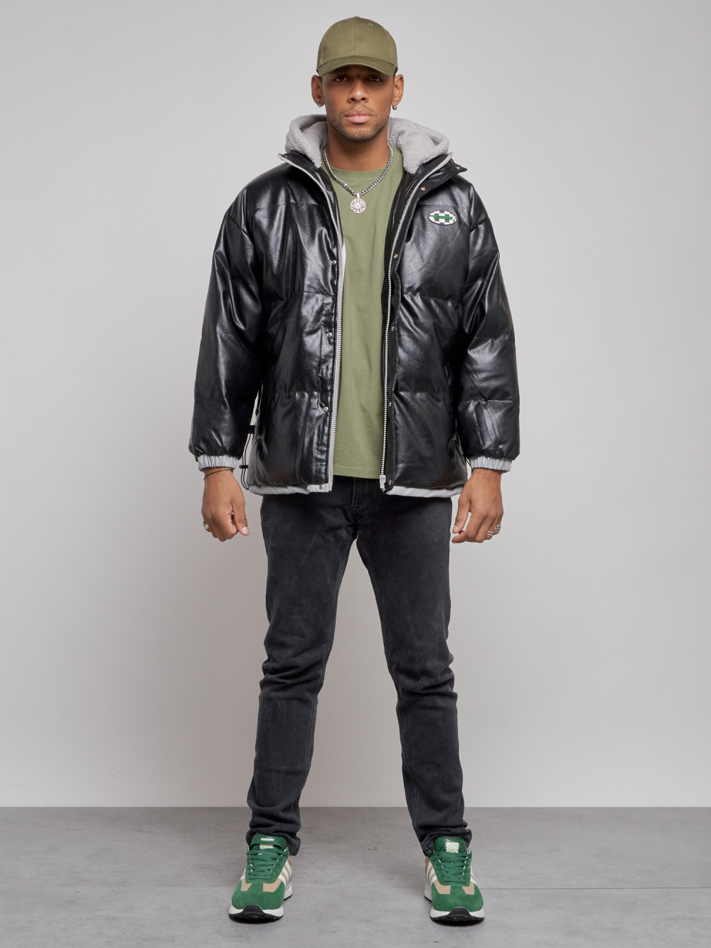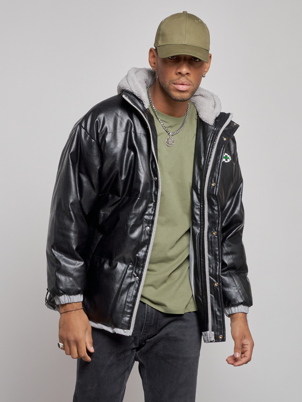 Куртка из экокожи мужская с плюшевым капюшон черного цвета 28132Ch