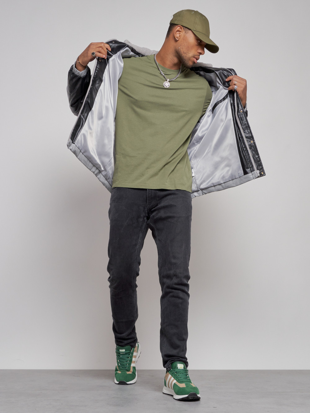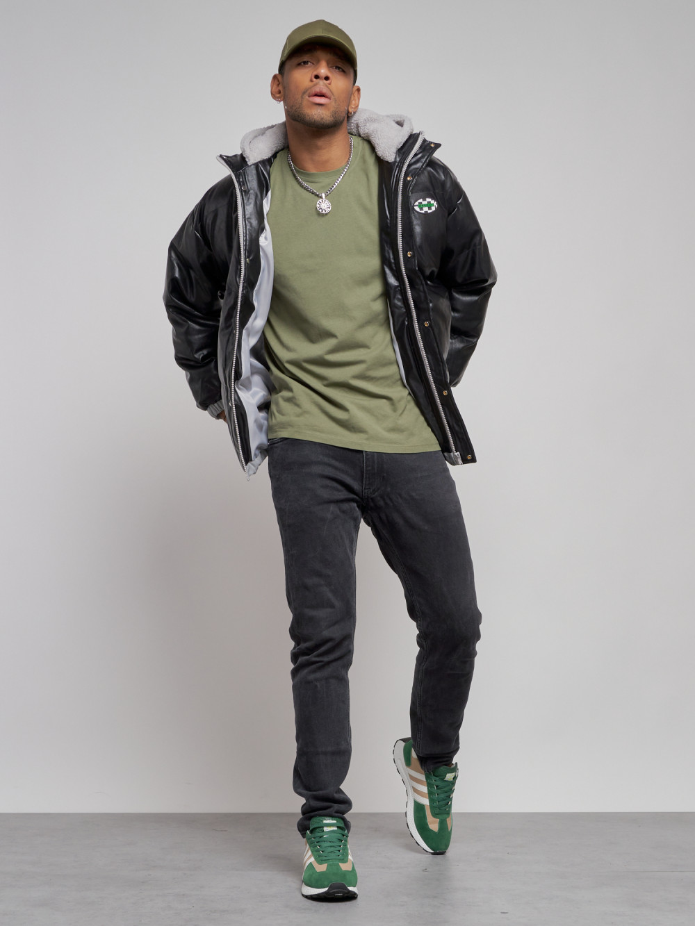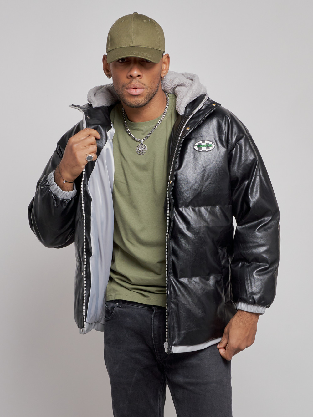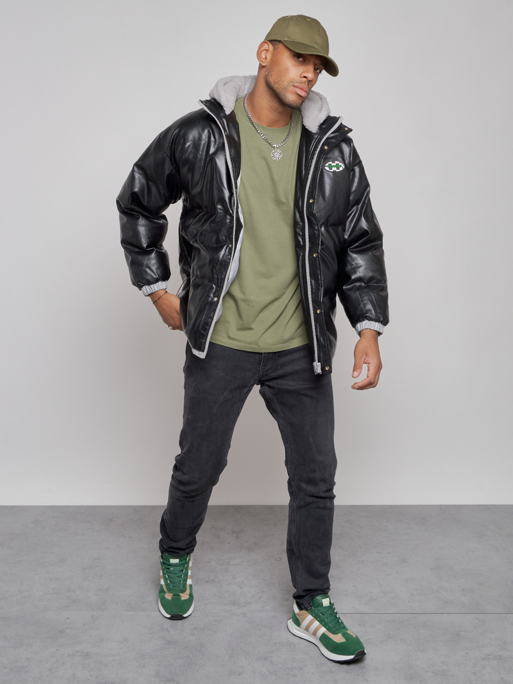 Куртка из экокожи мужская с плюшевым капюшон черного цвета 28132Ch