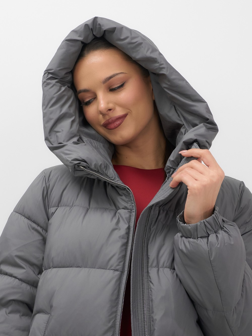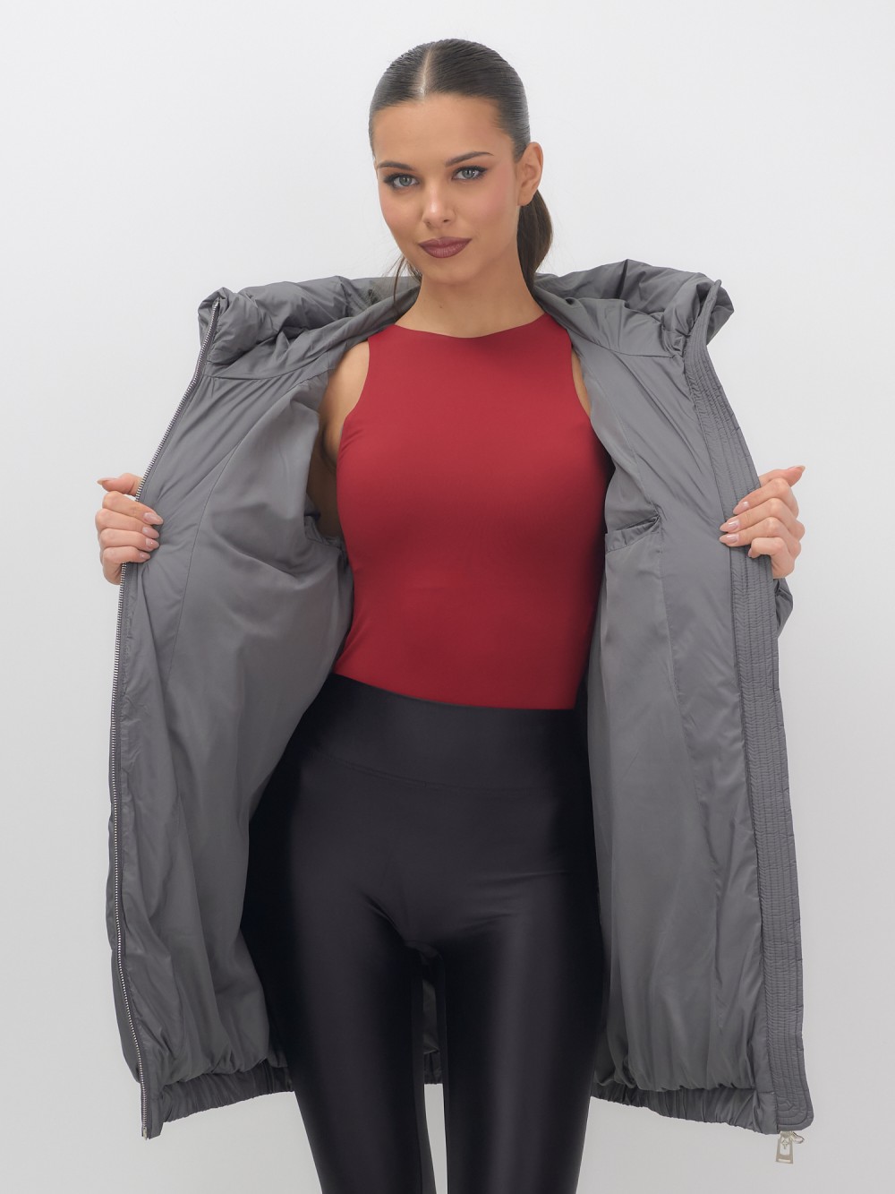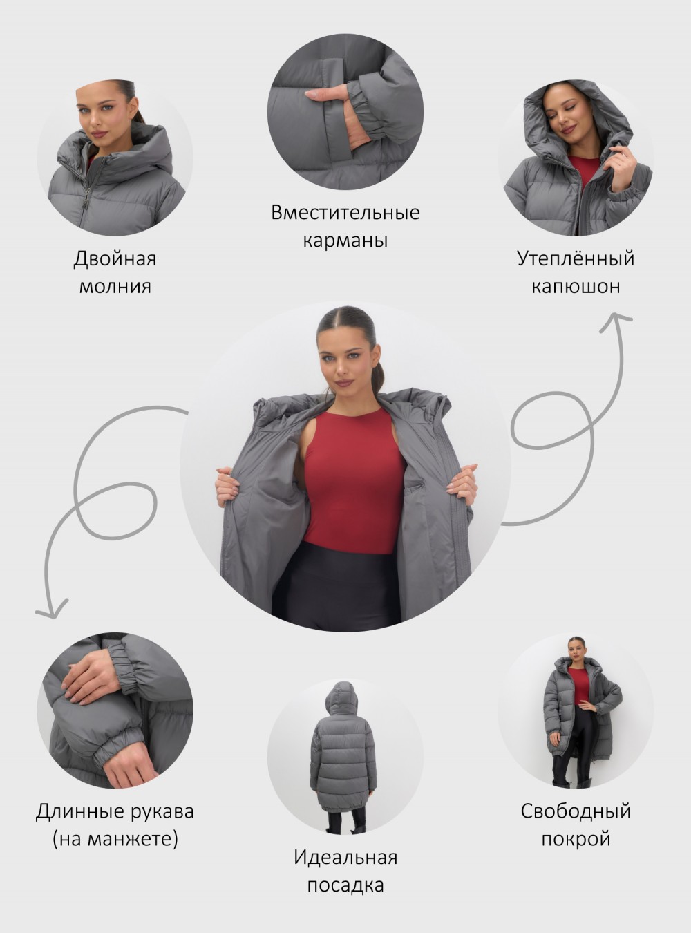 Дополнительные преимущества включают внутренние карманы для удобства, а также дышащий и гипоаллергенный материал, который не вызывает дискомфорта. Съемный воротник и фиксатор на капюшоне добавляют модели элегантности и функциональности.