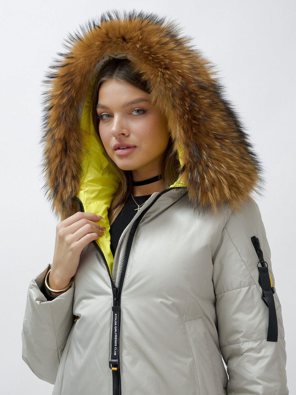 — Несъемный капюшон с съемной опушкой из натурального меха енота: обеспечивает тепло и защиту от холода, добавляя изысканности вашему образу.