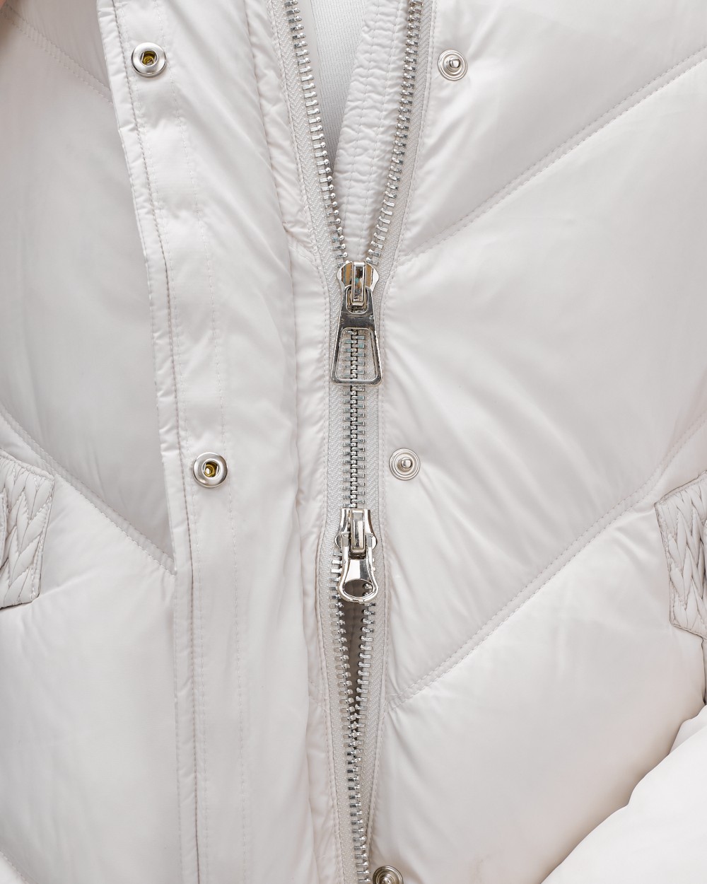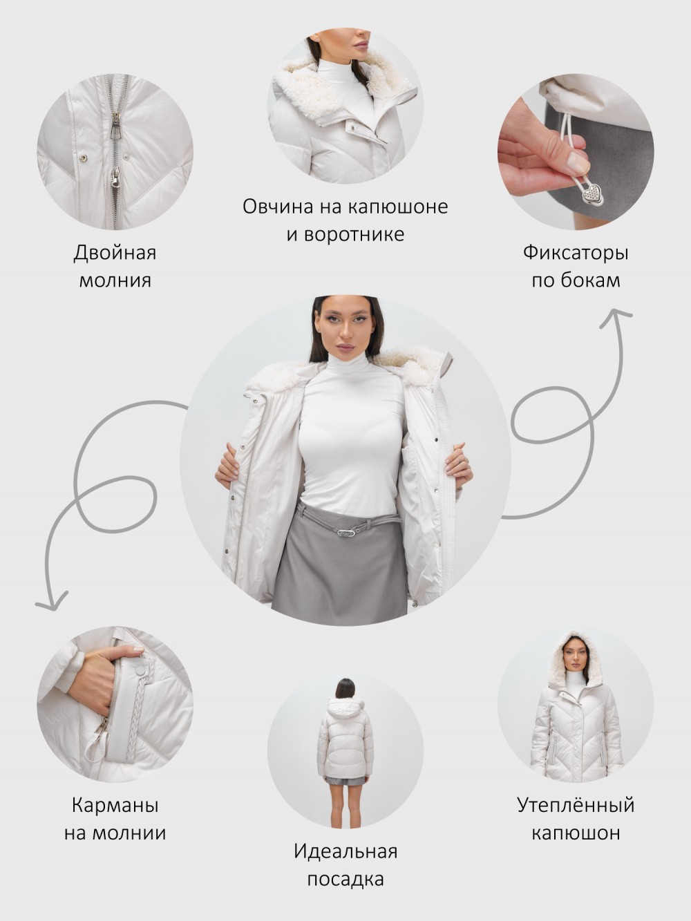 Куртка представлена в классических цветах: черный, бежевый и серый, что позволяет легко сочетать её с любыми нарядами. Практичные карманы на кнопках и молниях обеспечивают удобное хранение мелочей, а фиксаторы по низу помогают регулировать посадку.