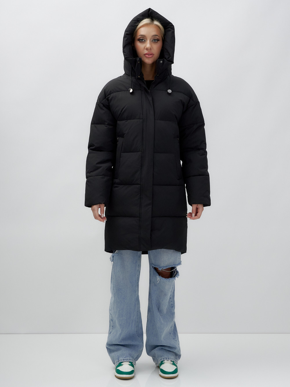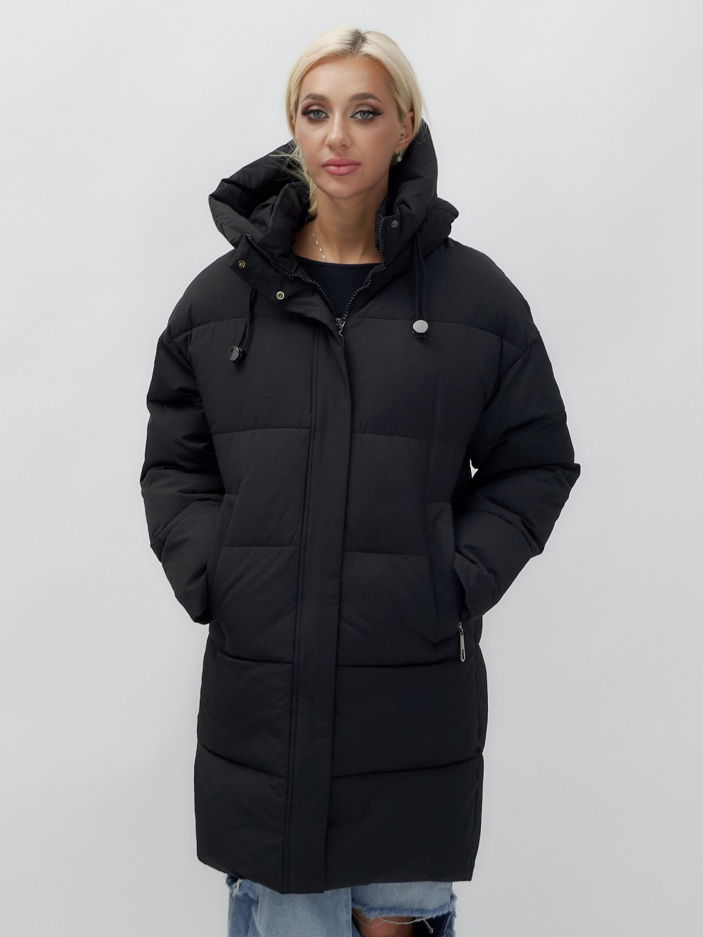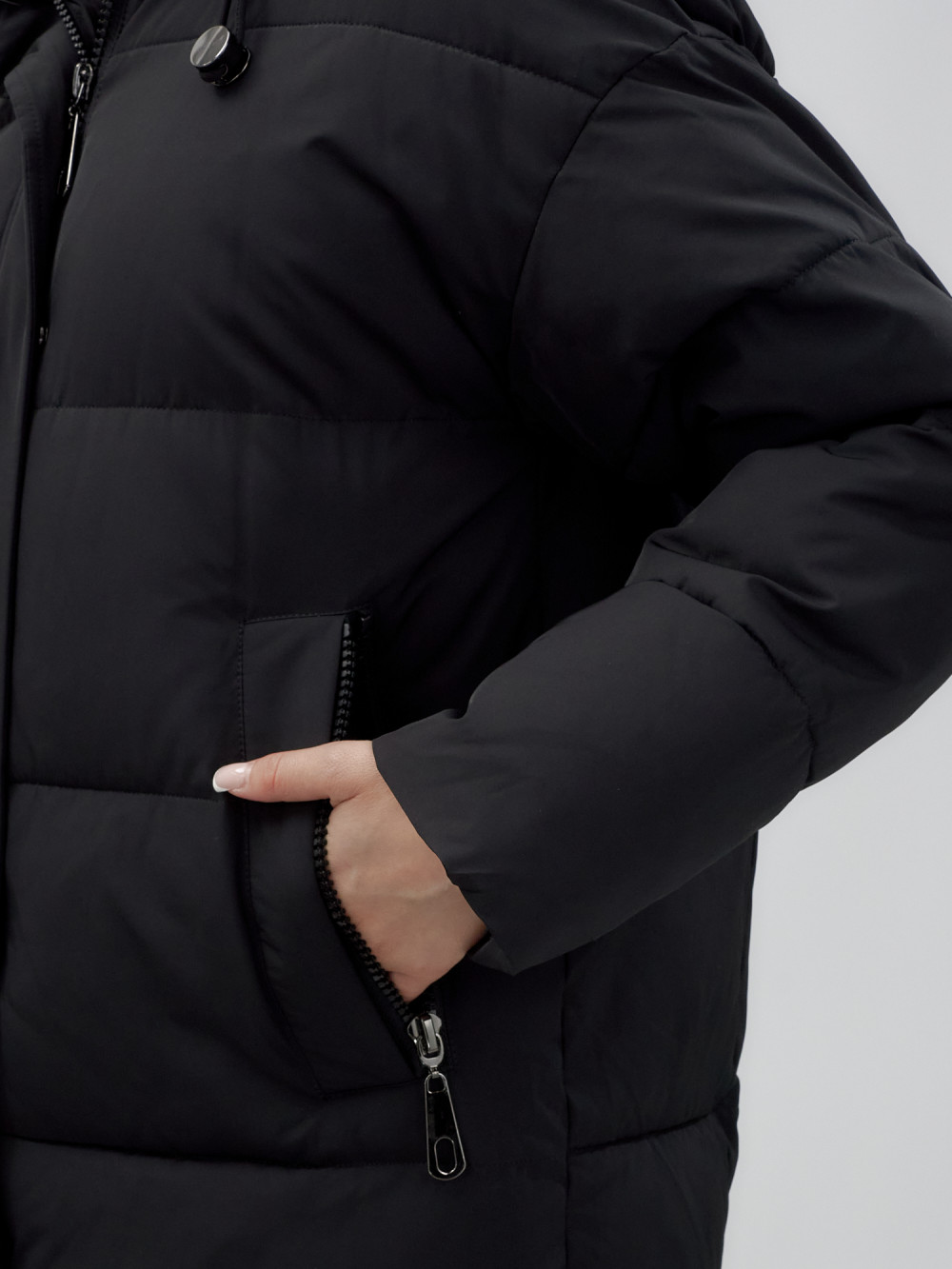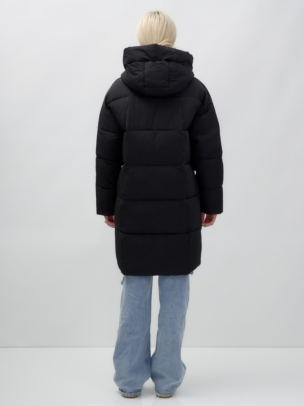 Куртка зимняя женская с капюшоном удлиненная стеганная черного цвета 9638Ch