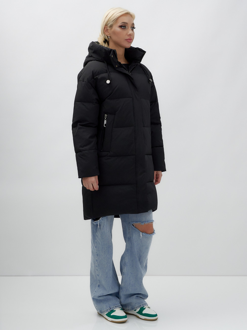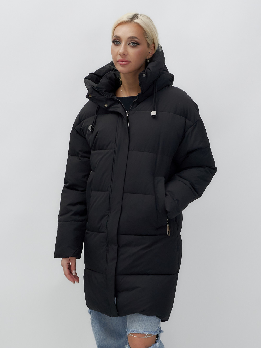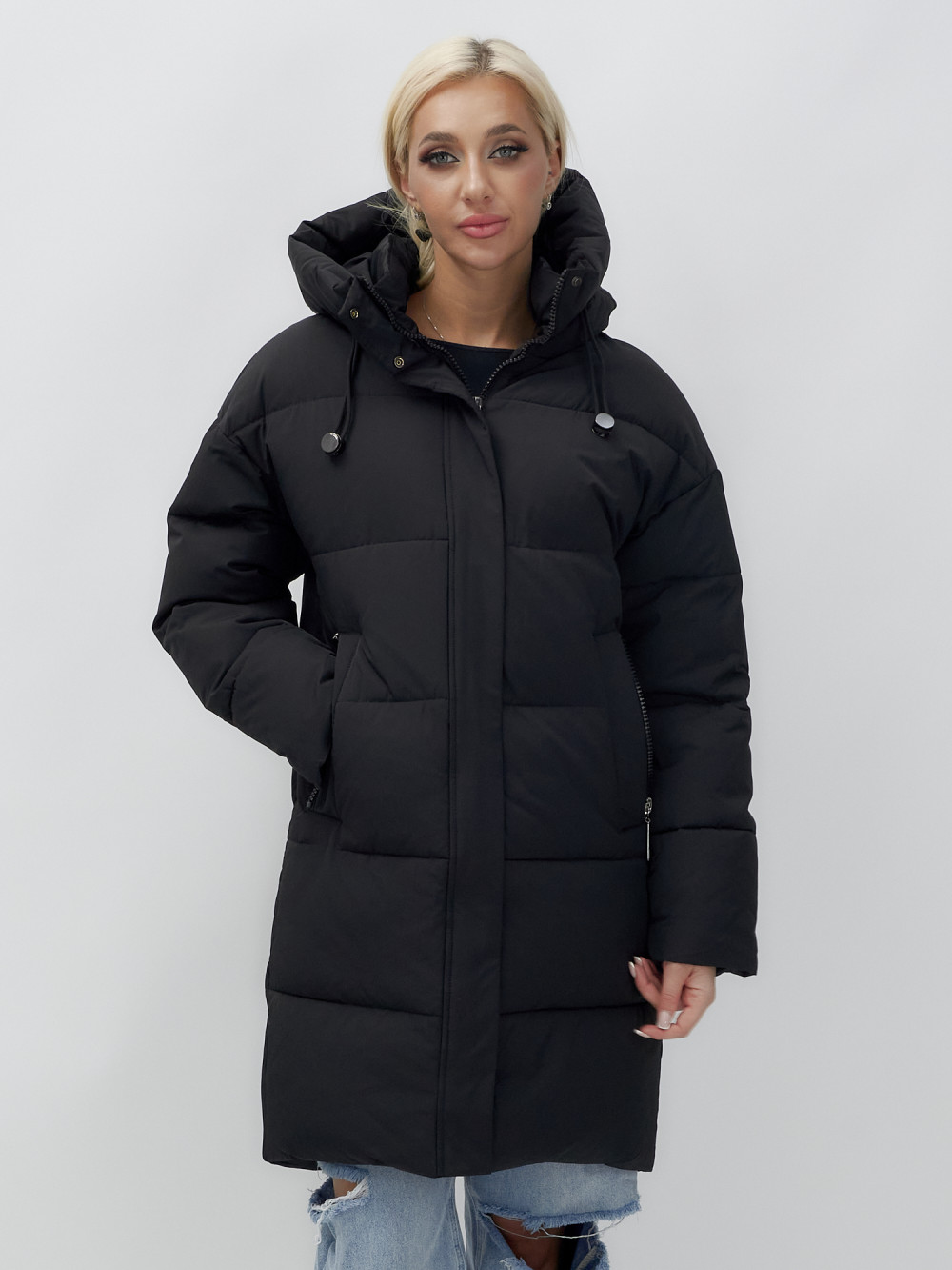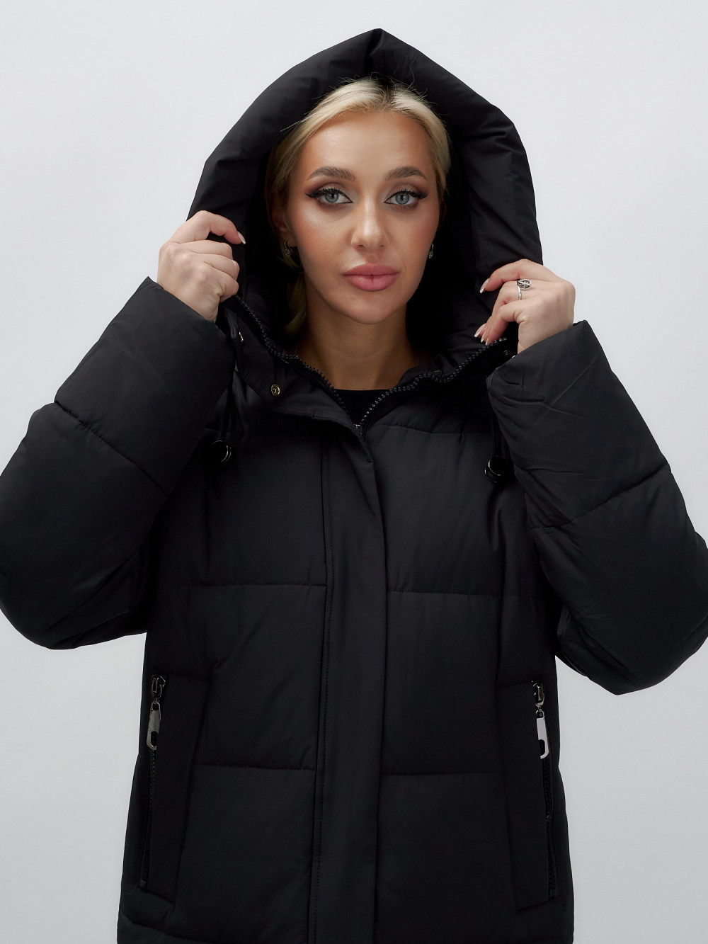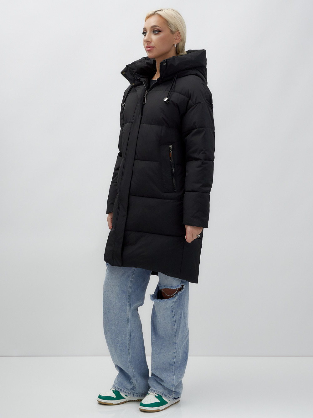 Куртка зимняя женская с капюшоном удлиненная стеганная черного цвета 9638Ch