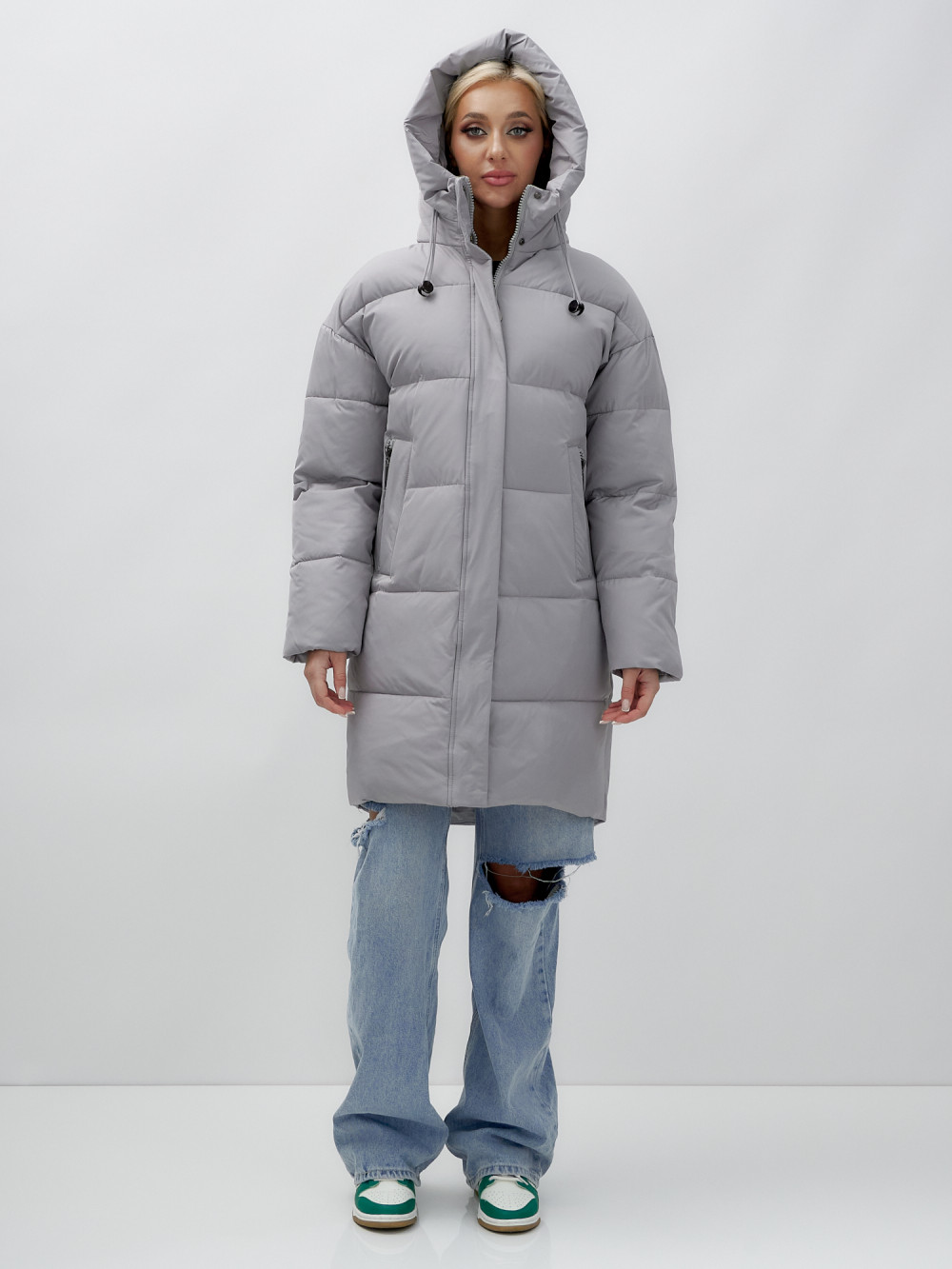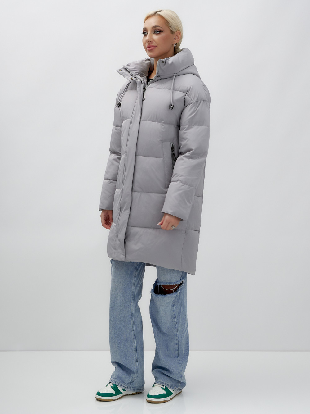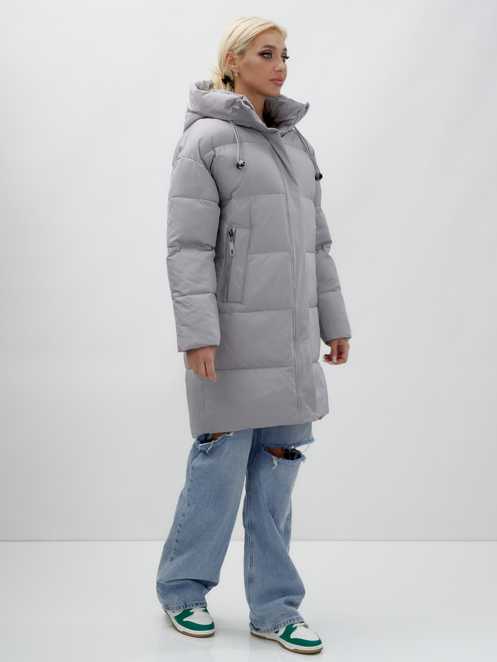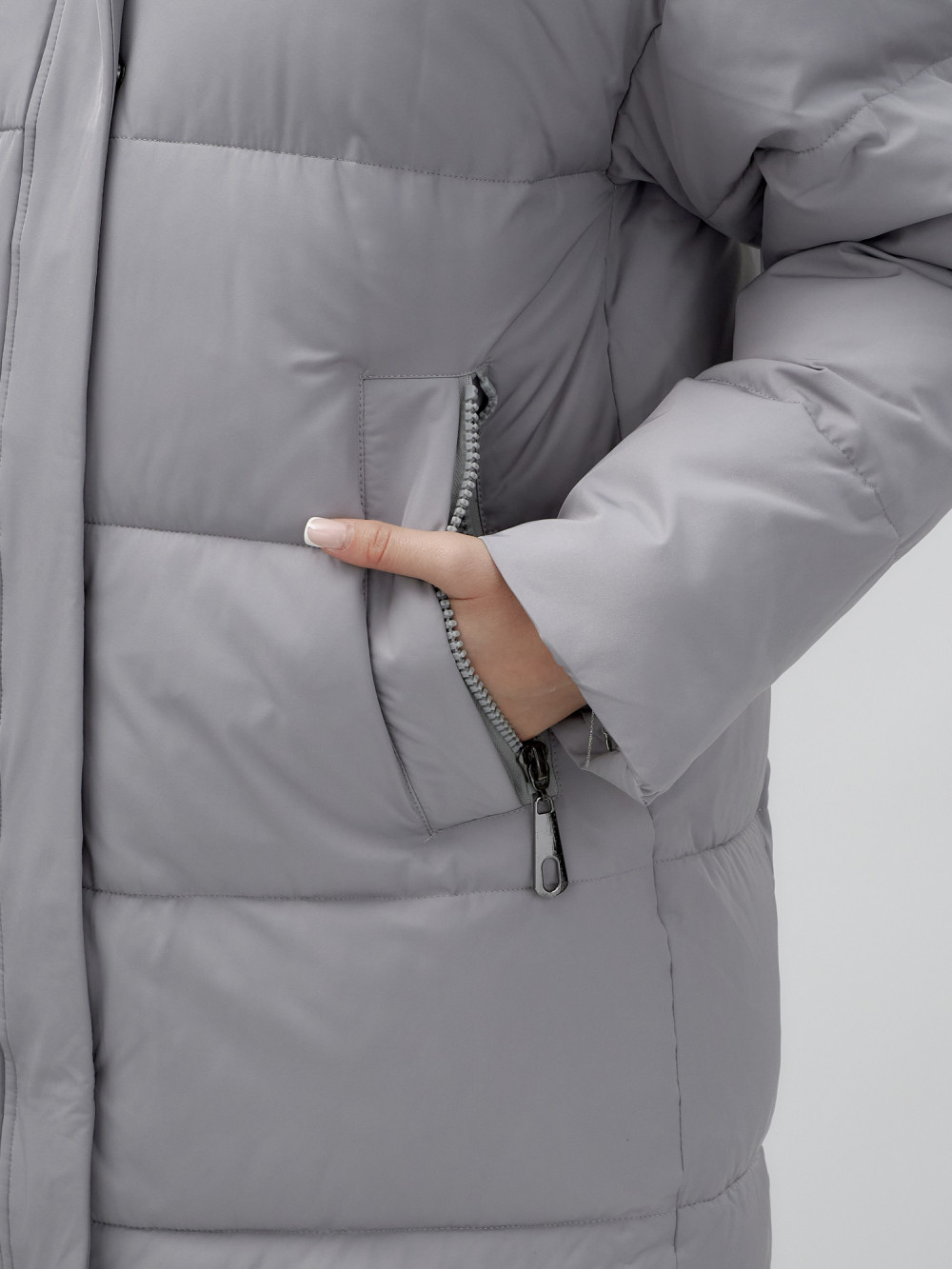 Куртка зимняя женская с капюшоном удлиненная стеганная серого цвета 9638Sr