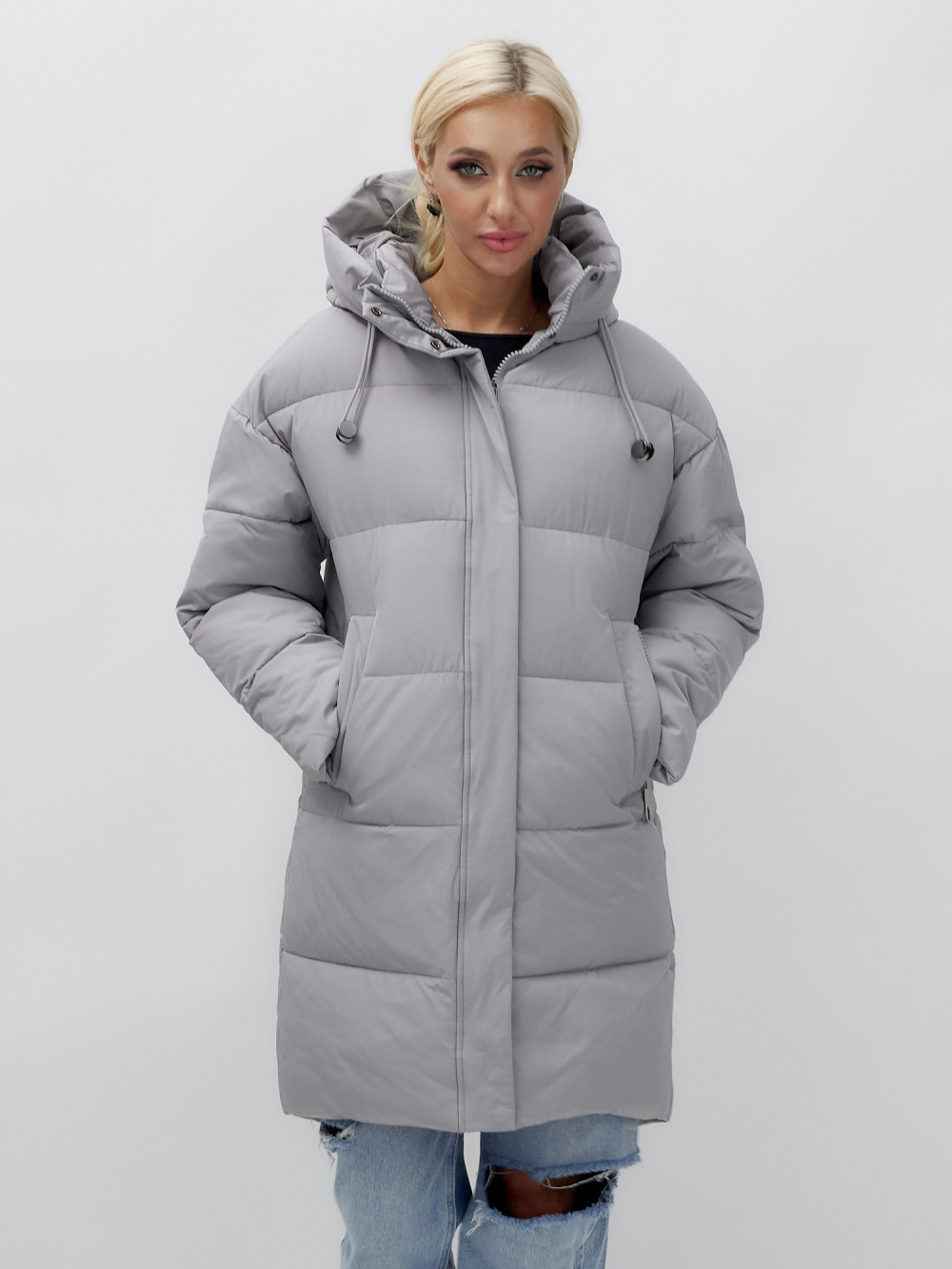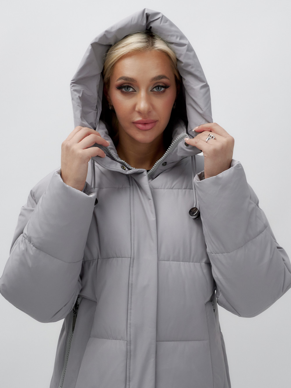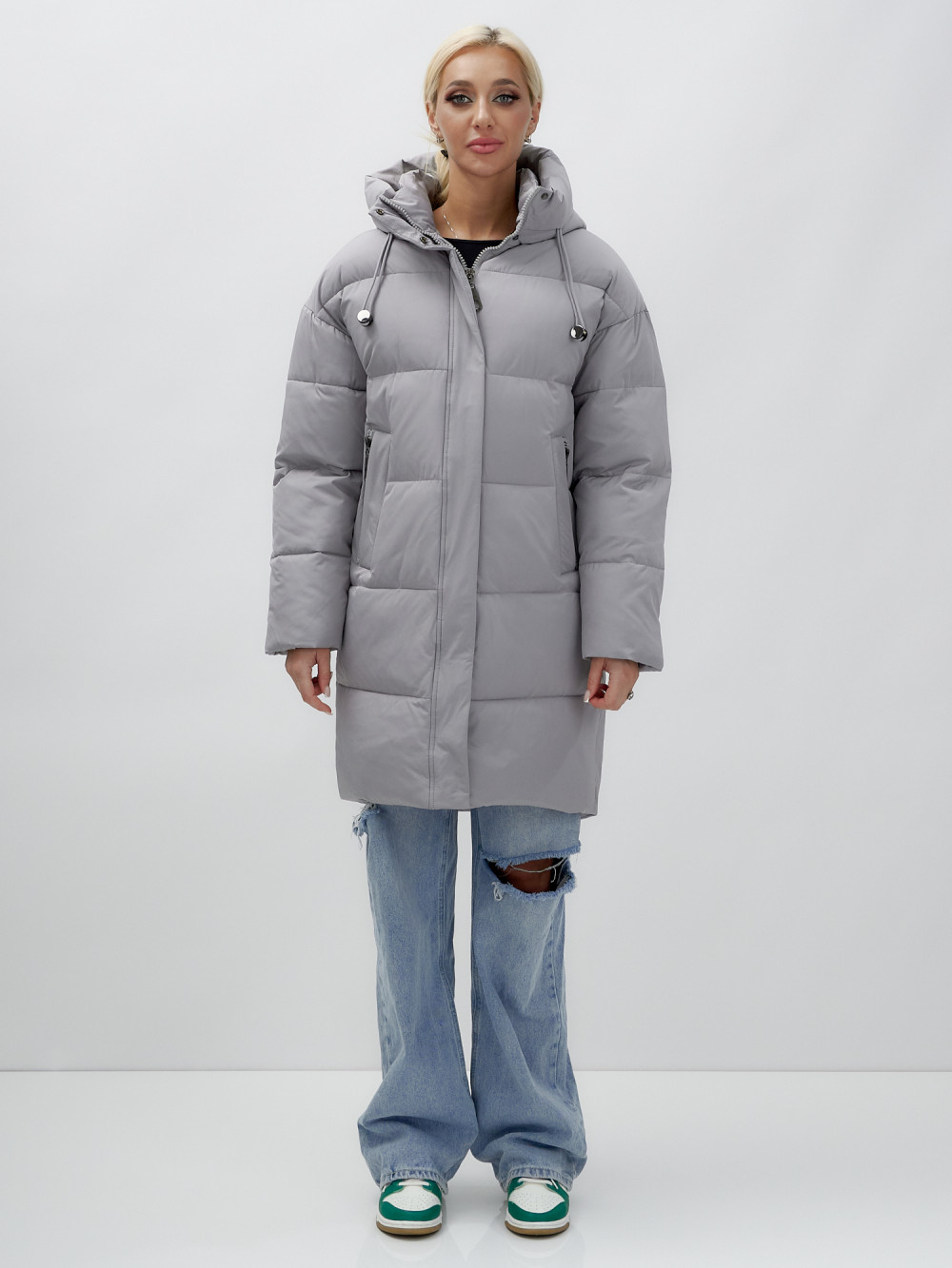Куртка зимняя женская с капюшоном удлиненная стеганная серого цвета 9638Sr