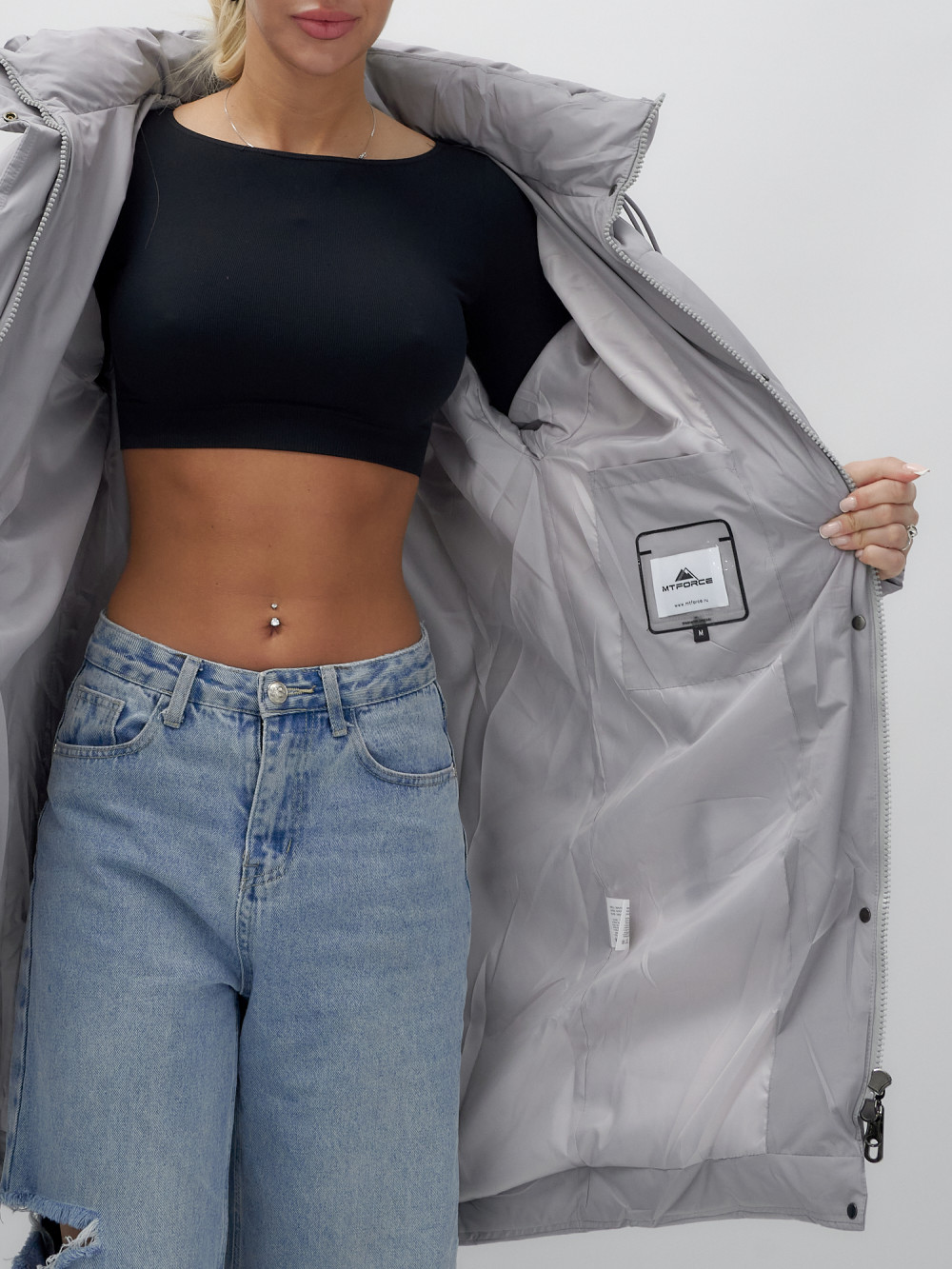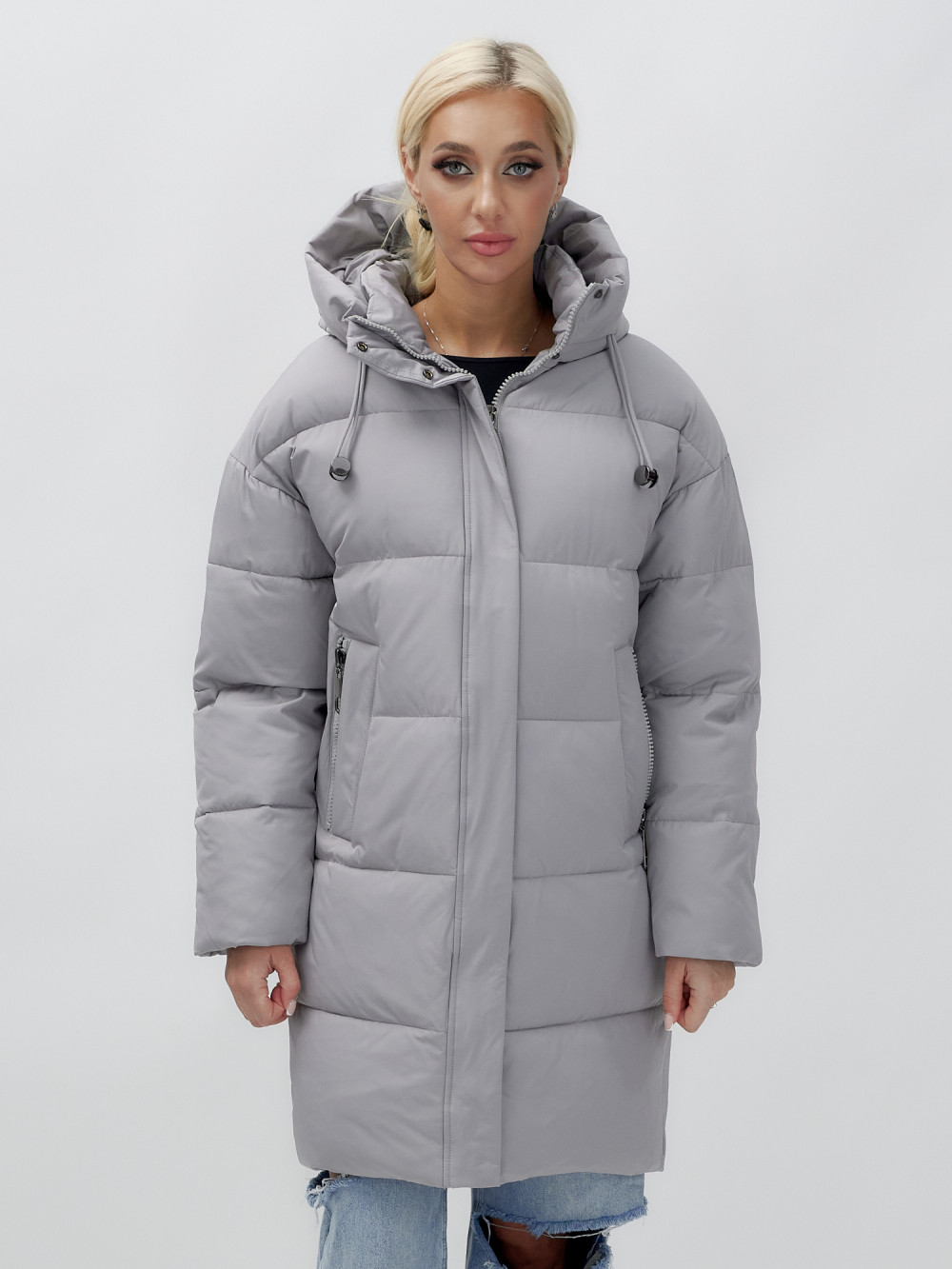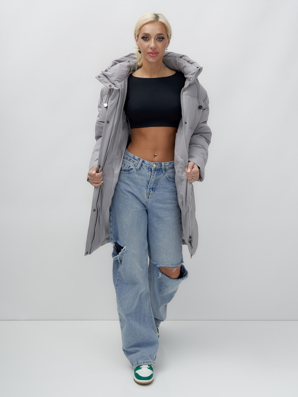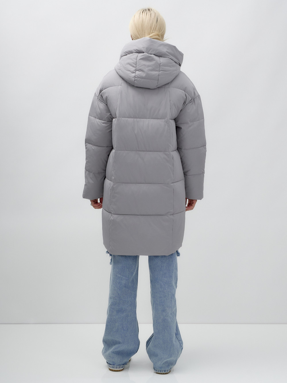 Куртка зимняя женская с капюшоном удлиненная стеганная серого цвета 9638Sr