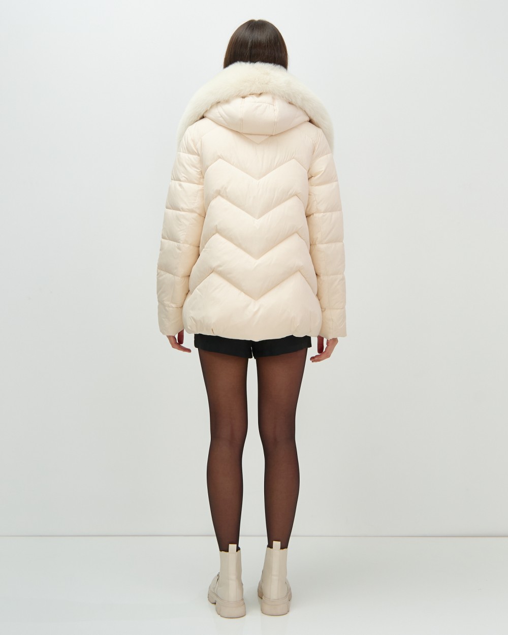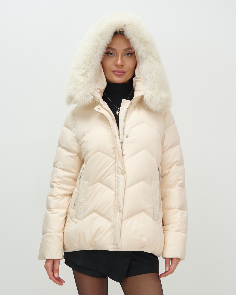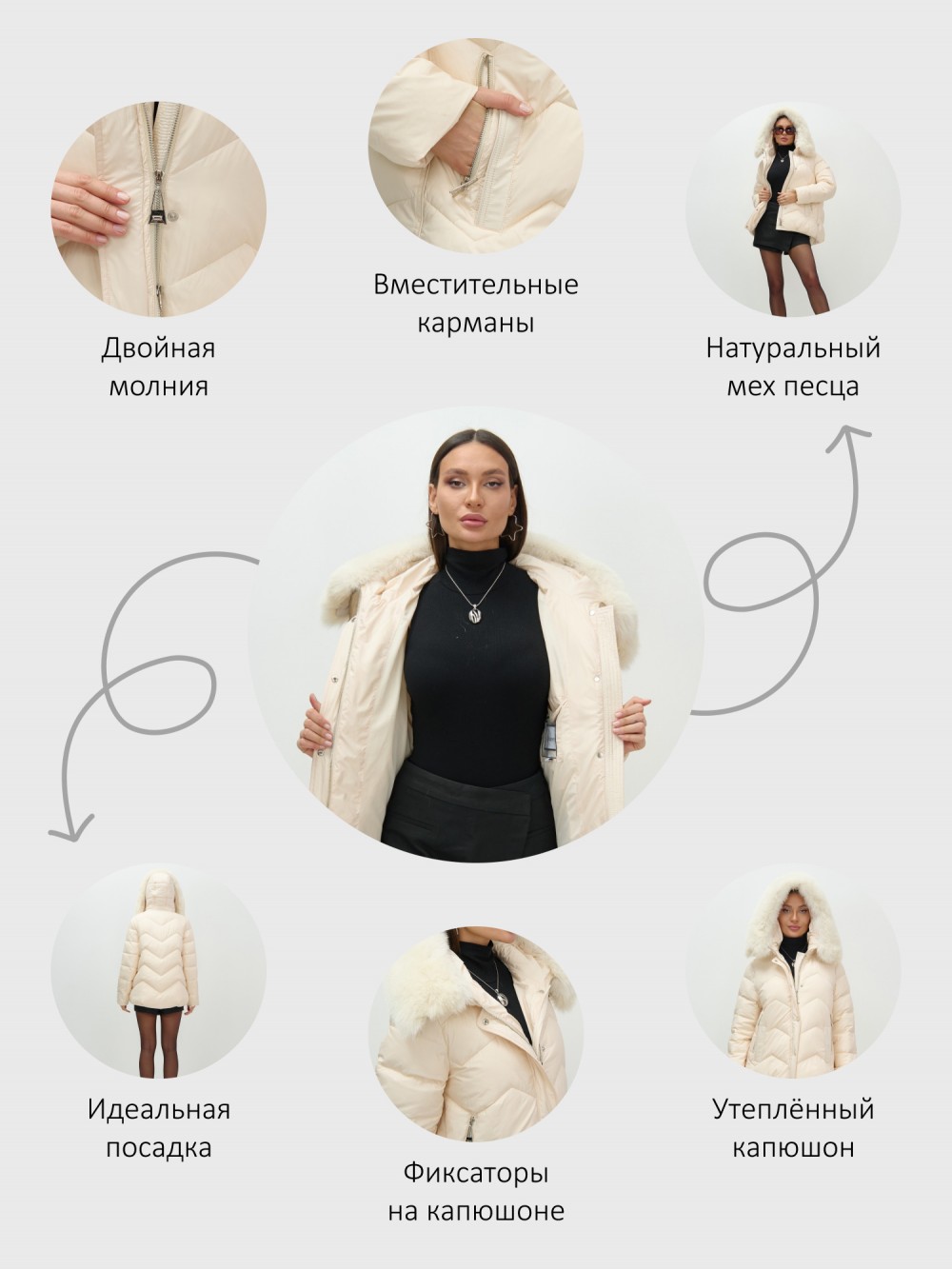 Утеплитель плотностью 200 г/м² обеспечивает комфорт при температурах от +5° до -20°C. Роскошный натуральный мех песца обрамляет лицо, создавая неповторимый образ городской леди. Безупречный крой подчеркивает силуэт, оставляя свободу движений.