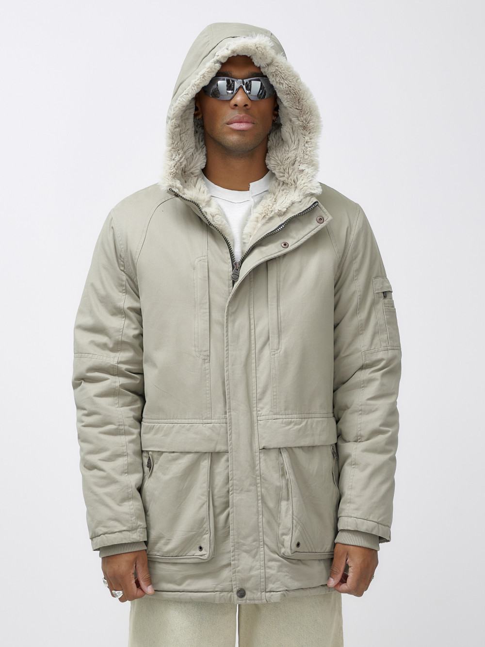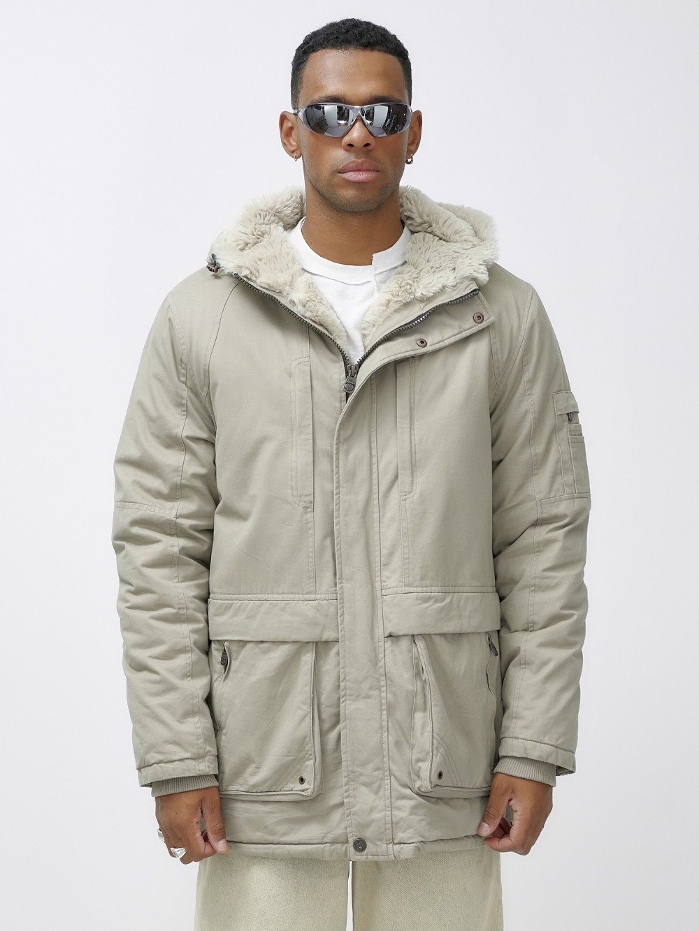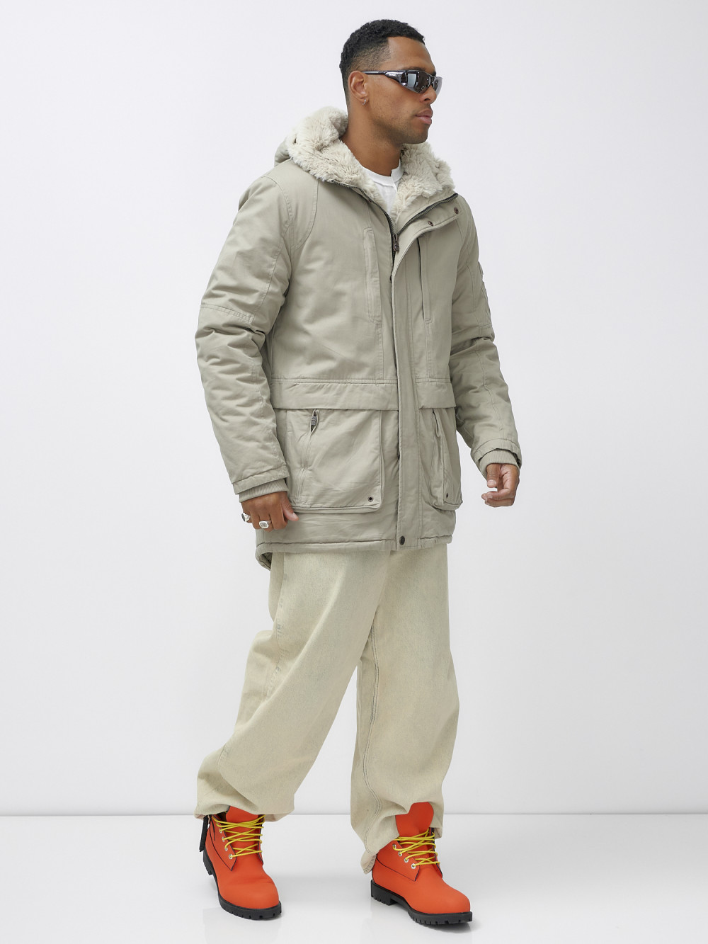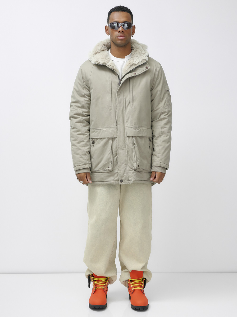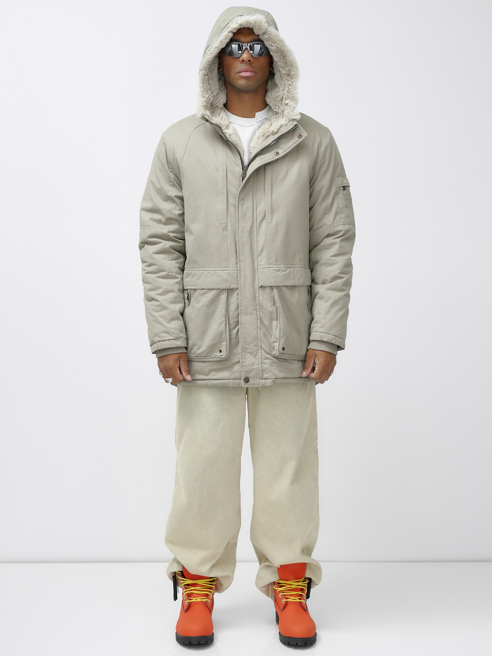 Парка мужская зимняя удлиненная с мехом бежевого цвета 2608B