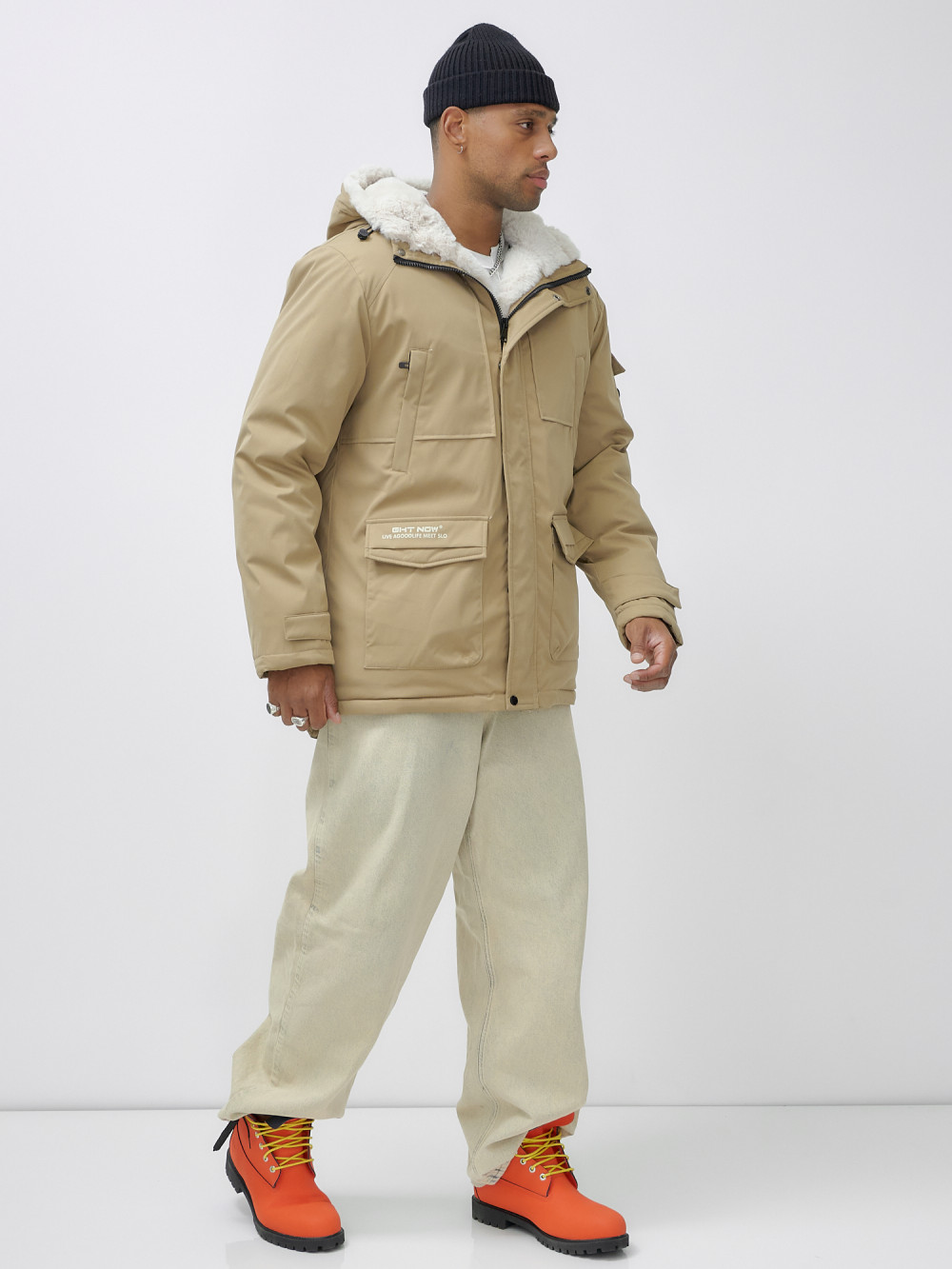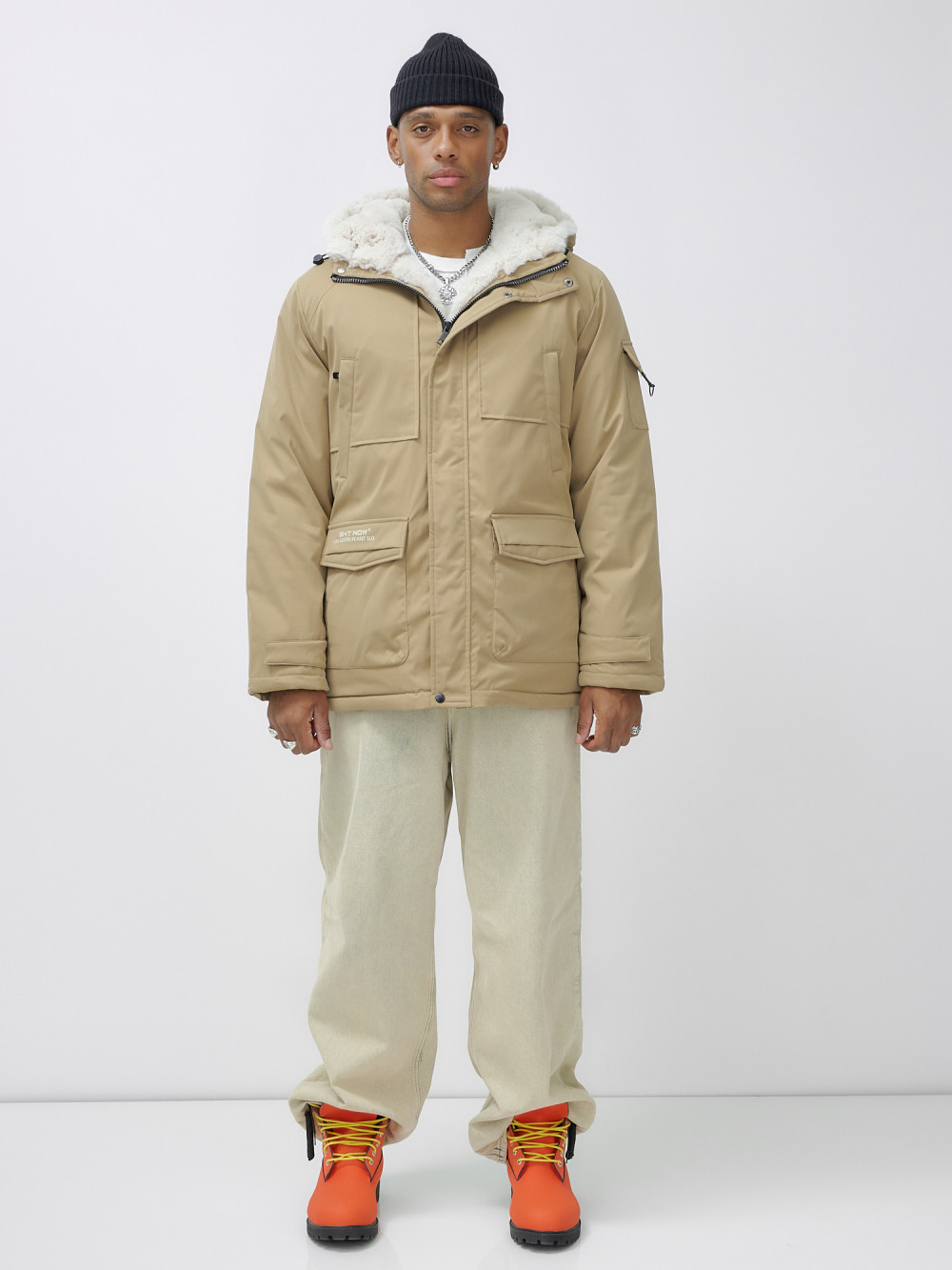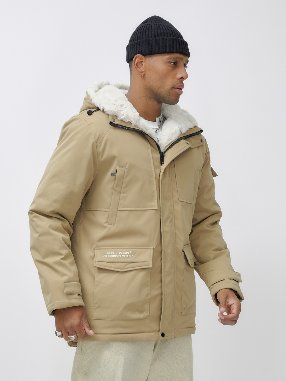 Парка мужская зимняя удлиненная с мехом горчичного цвета 8751G
