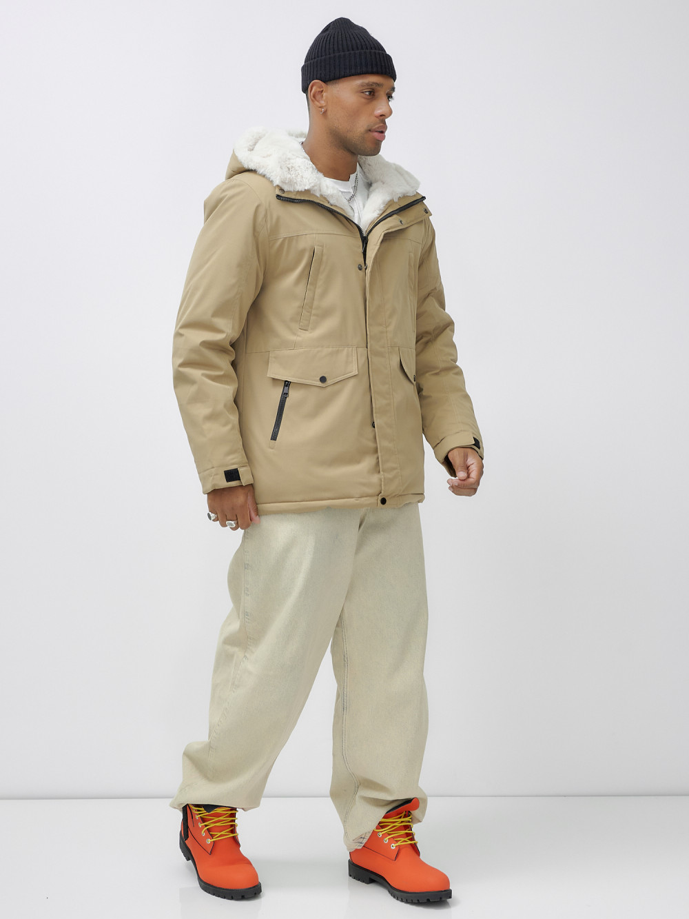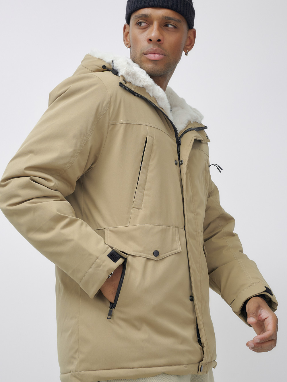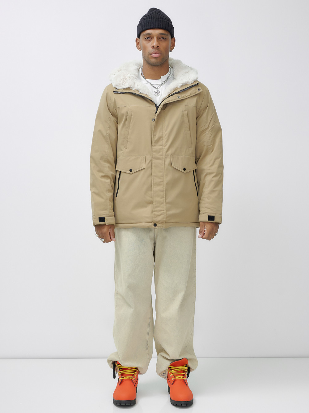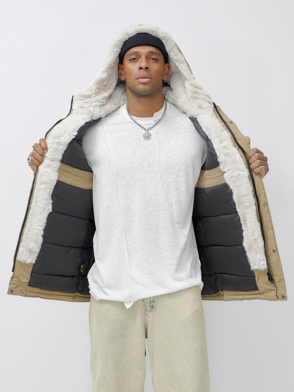 Парка мужская зимняя удлиненная с мехом горчичного цвета 8755G