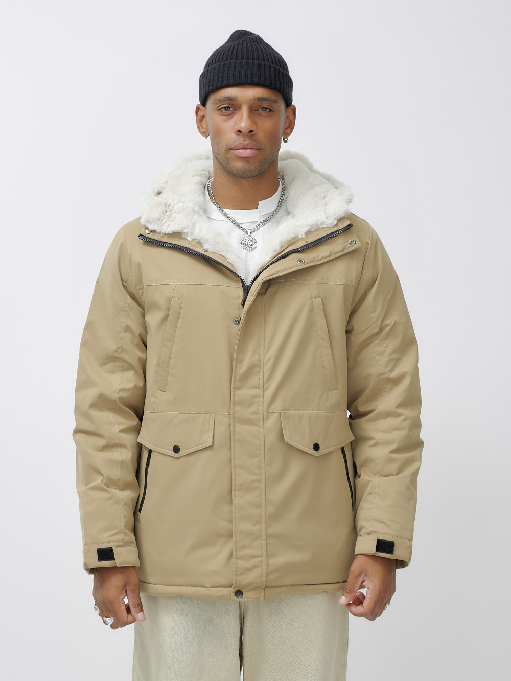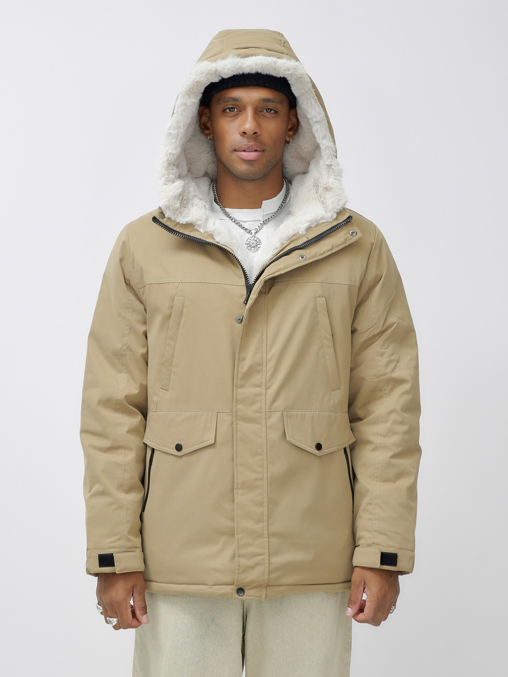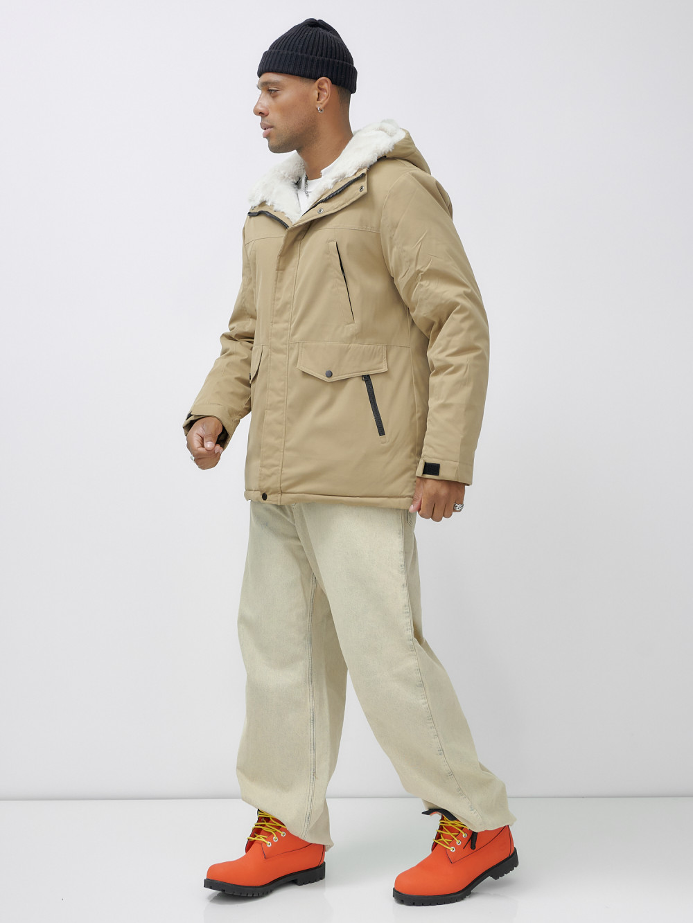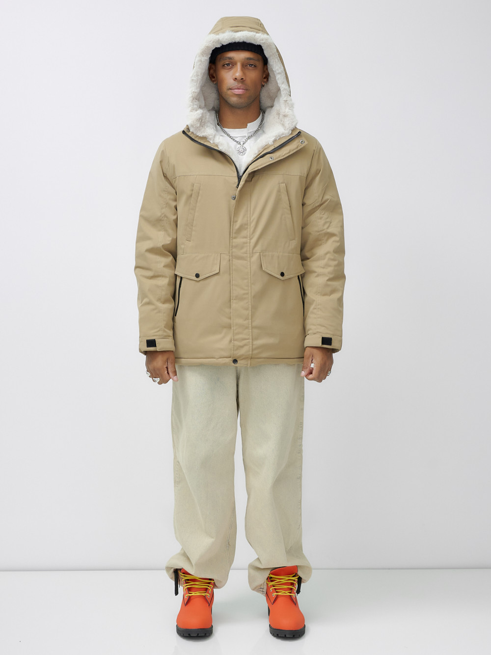 Парка мужская зимняя удлиненная с мехом горчичного цвета 8755G