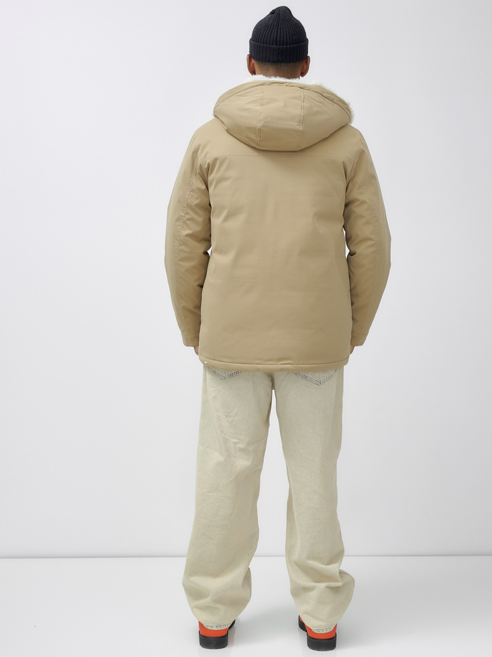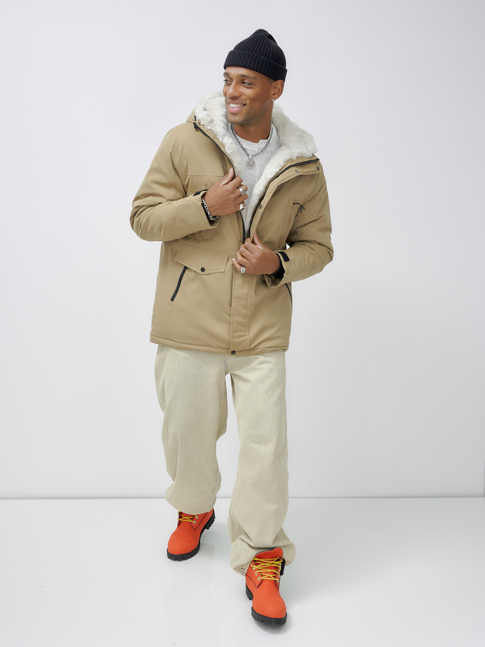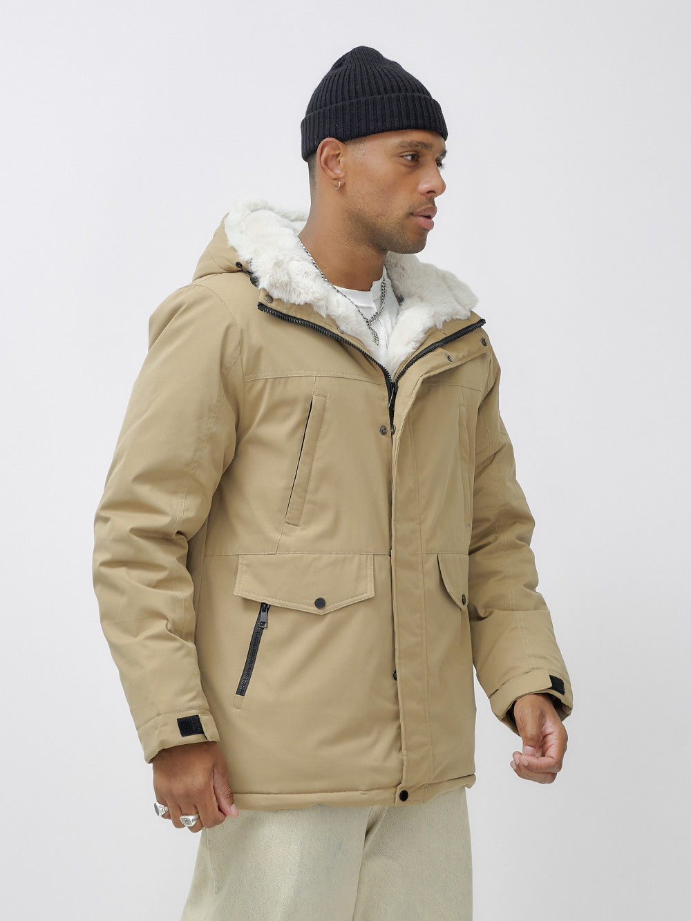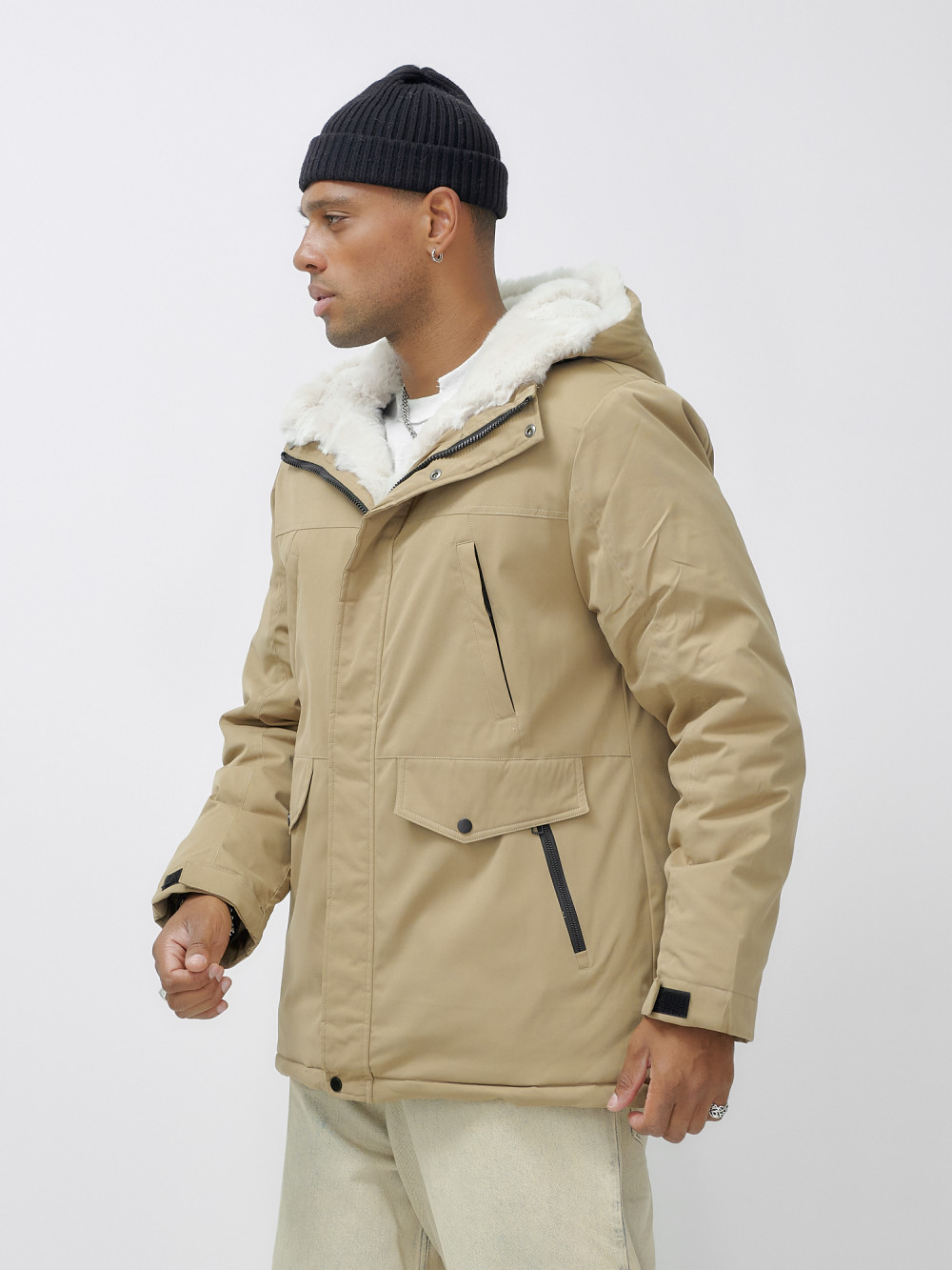 Парка мужская зимняя удлиненная с мехом горчичного цвета 8755G